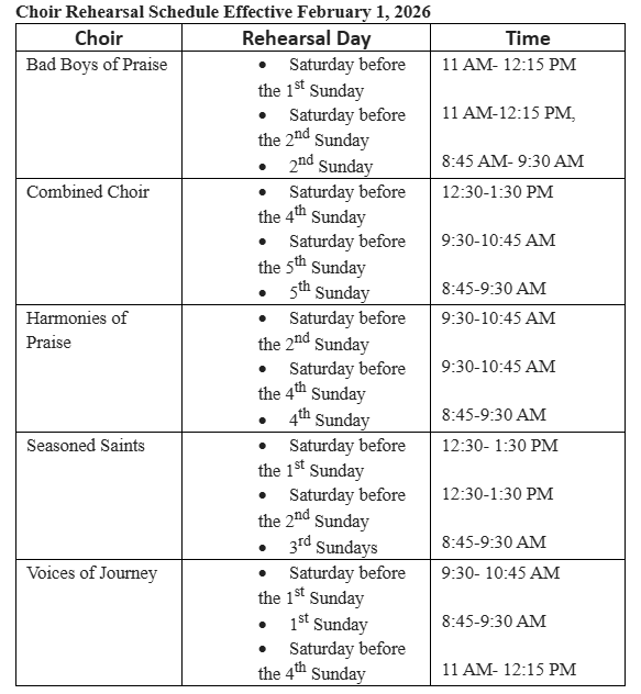Choir Rehearsal Schedule Effective February 1, 2026